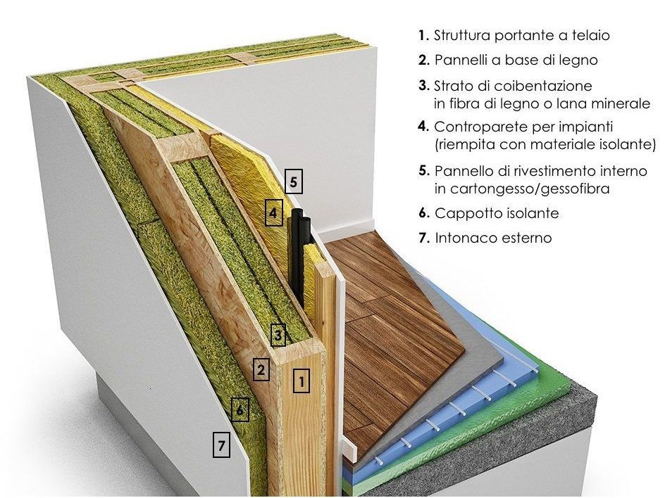 Le stratigrafie delle pareti a telaio possono variare per materiali, spessori e prestazioni, ma prevedono quasi sempre una struttura portante principale in legno lamellare GL24H, con un interasse compreso tra 60 e 80 cm.